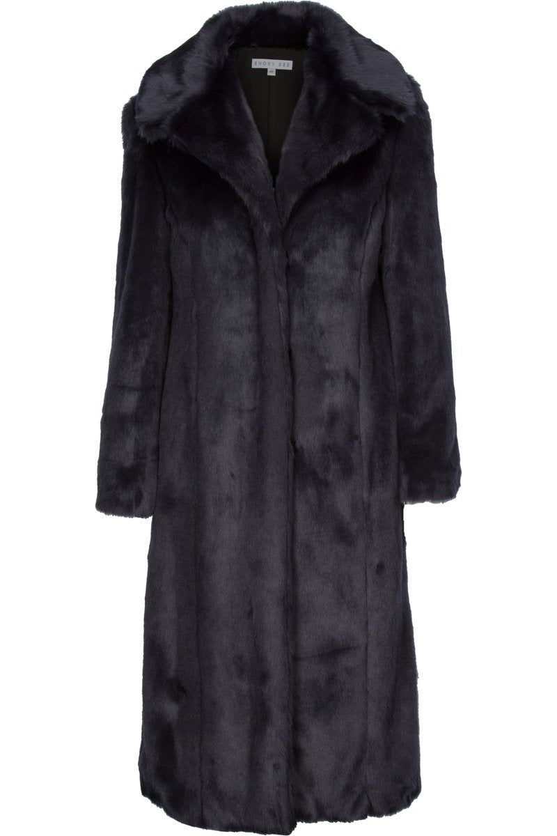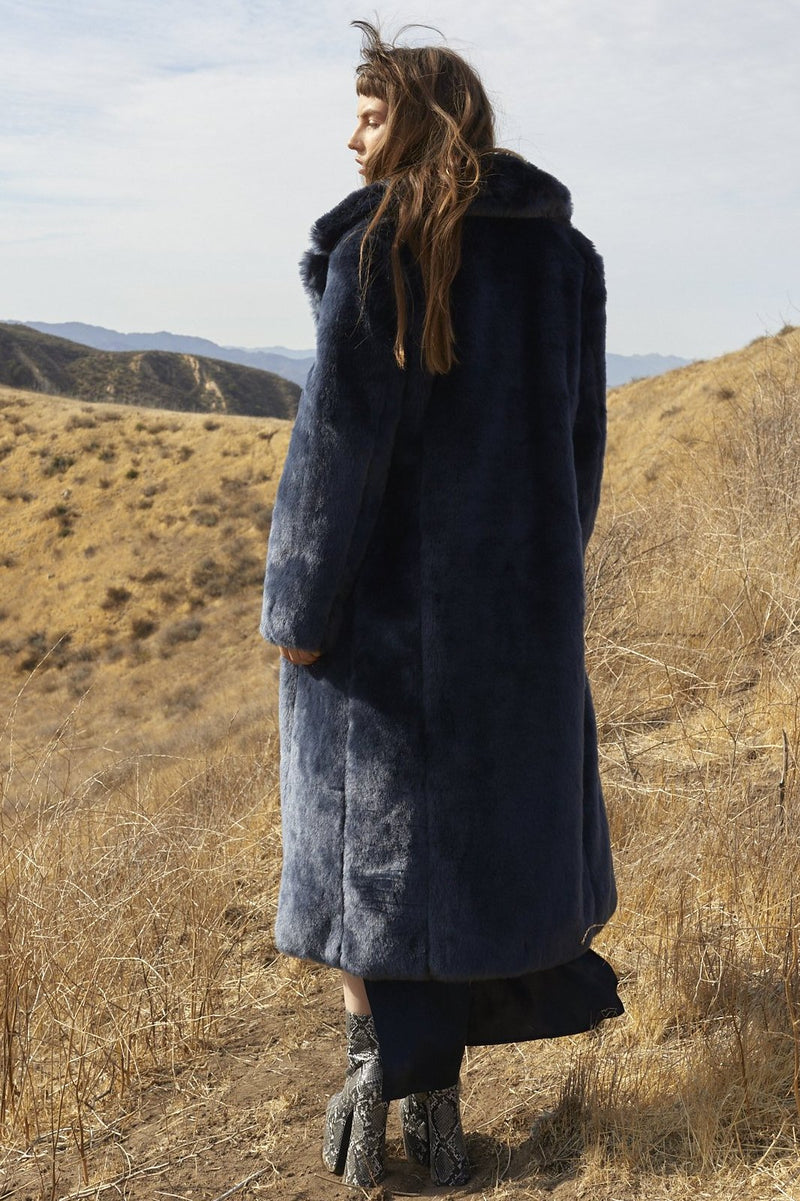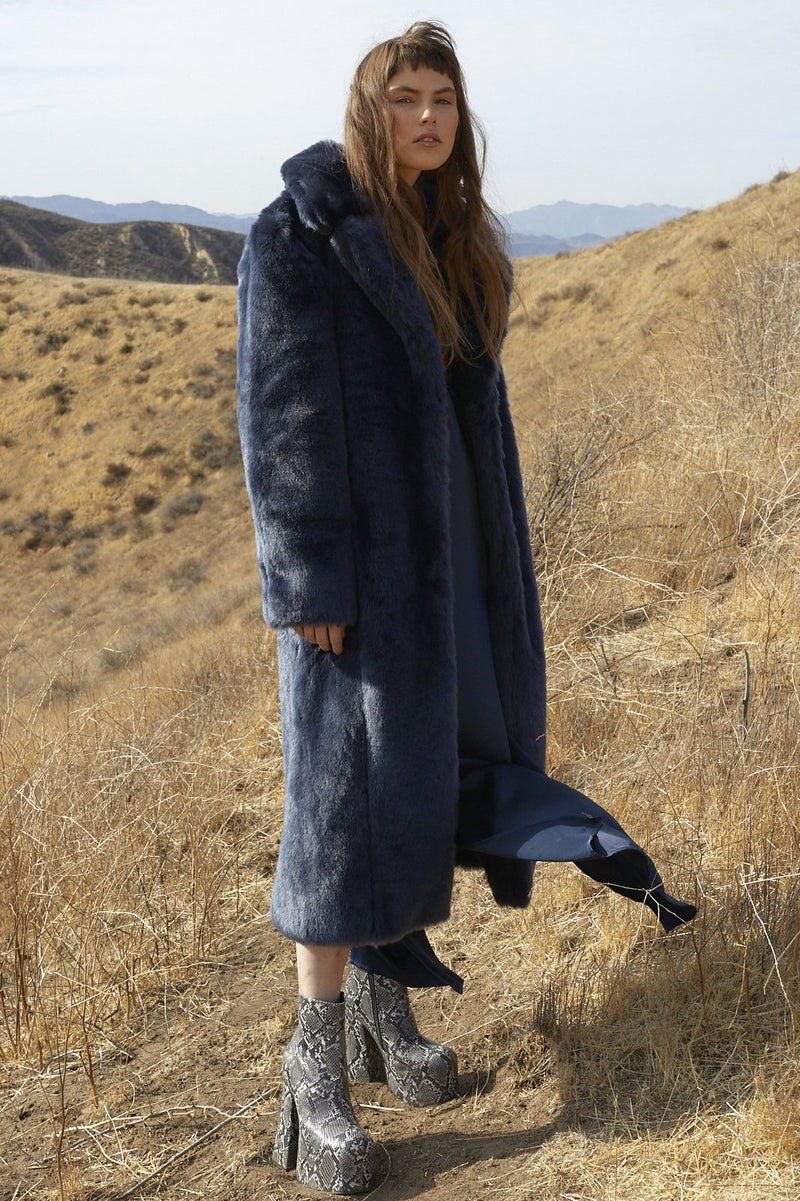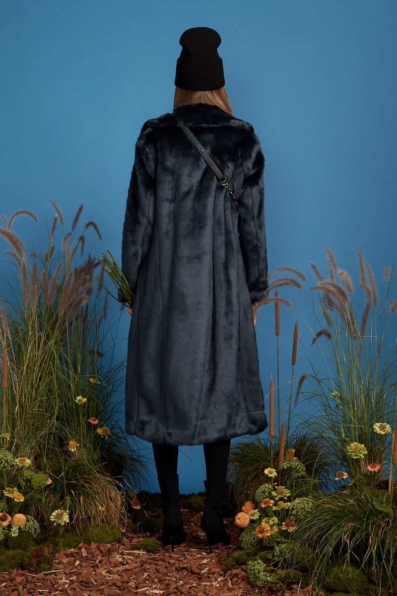 Made from plush imported faux fur, this full length coat pairs perfectly over layers or just a simple slip dress. Constructed with a silky lining, side slit pockets and concealed hook and bar fastenings. Style with our coordinating steel blue faux fur scarf. This coat is also adorned with hidden interior shoulder straps to secure an over the shoulder look without falling and sliding.