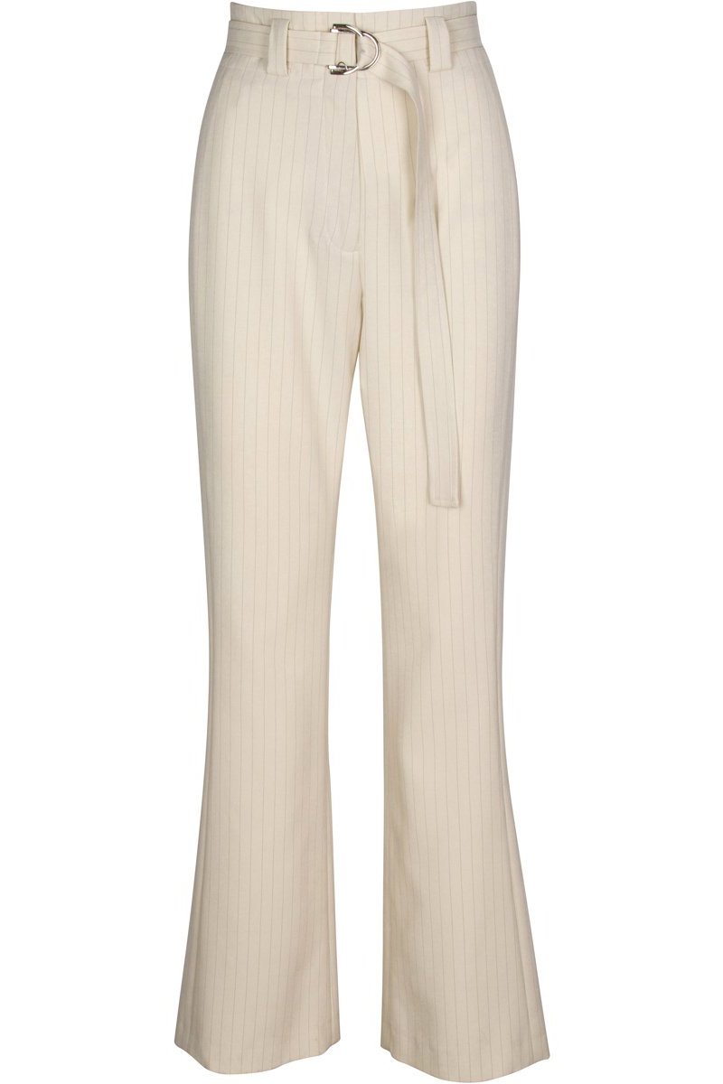 High waisted, straight leg trousers with subtle flare at hem. Adjustable belt at waist. Can be ...