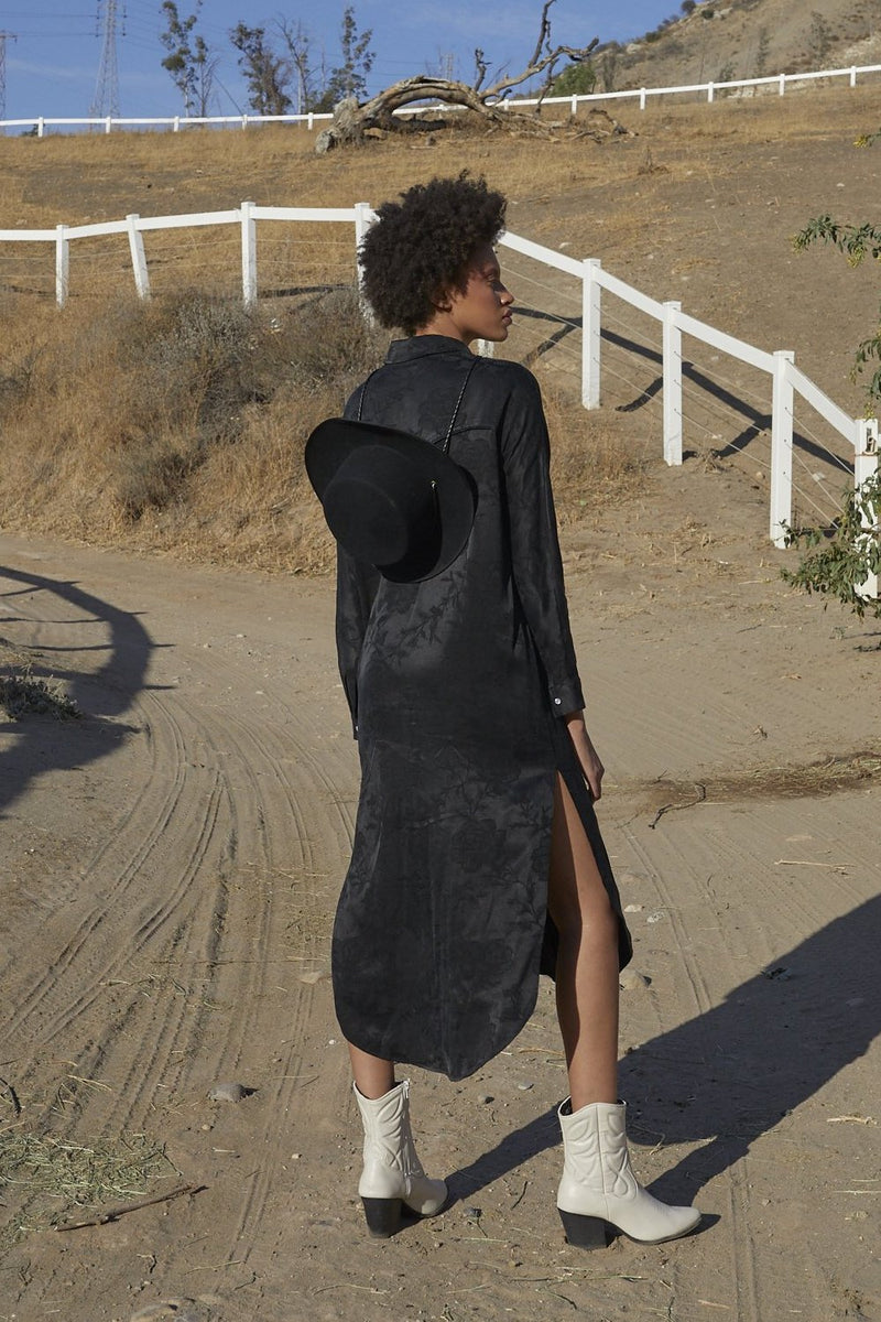 Western inspired details elevate the classic staple shirt dress. With adjustable snap pearl buttons up the front and mid thigh side slits, this piece lets you show as much or as little as you desire.