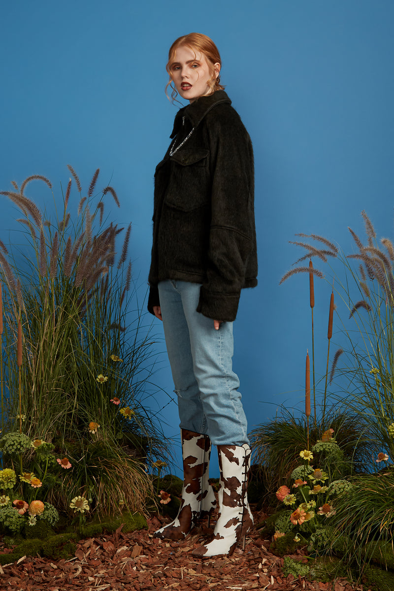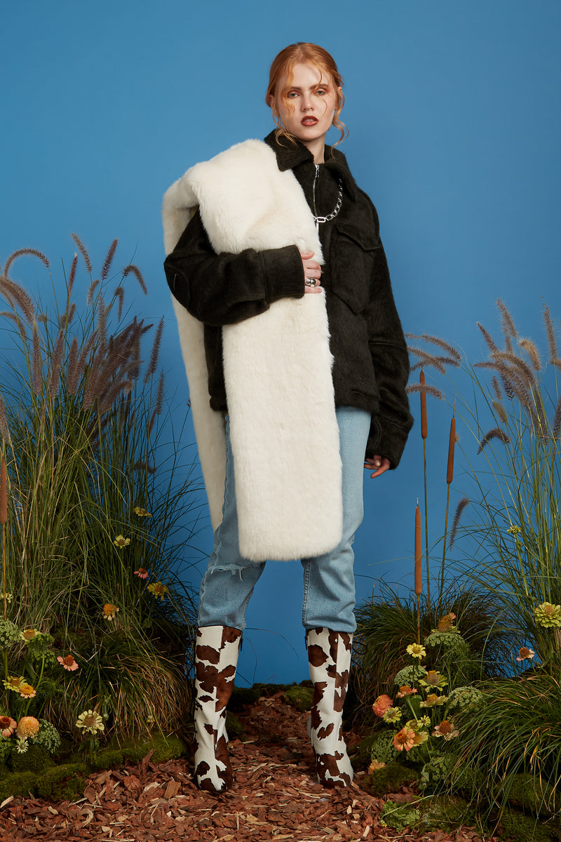 100% cruelty free fuzzy jacket hugs you like the softest blanket. Based on a nostalgic classic mens jacket, this piece is beyond cozy and super easy to style. It’s the jacket that you will want to wear every single day.